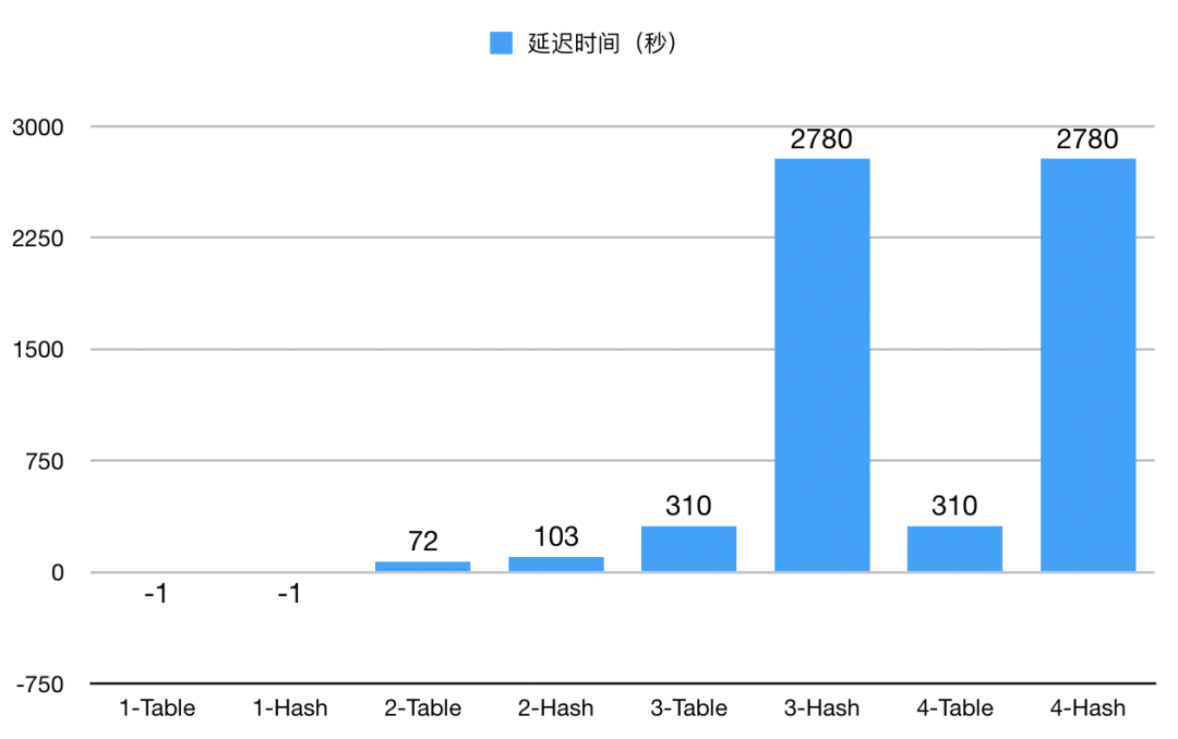 图例中 1-Table 代表场景1下,Table_Scan,Index_Scan 设置下的延迟时间,1-Hash 代表场景 1 下,Hash_Scan,Index_Scan 设置下的延迟时间。 场景 1 下,完全没有索引的时候延迟时间超过 24 小时,完全没有对比意义,因此取值为 -1。