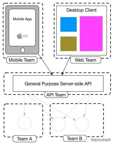 通用API后端承担多个职责的趋势,因此需要大量工作,通常会导致专门创建一个团队来处理这个代码库。这会使问题变得更糟,因为现在前端团队必须与一个单独的团队进行交互以获得所做的更改—一个团队必须平衡不同客户团队的优先级,并且还必须与多个下游团队合作,在新的API可用时使用它们。可以说,在这一点上,我们刚刚在我们的体系结构中创建了一个智能的中间件,它并不关注任何特定的业务领域,这与许多人对明智的面向服务的体系结构应该是什么的看法背道而驰。
