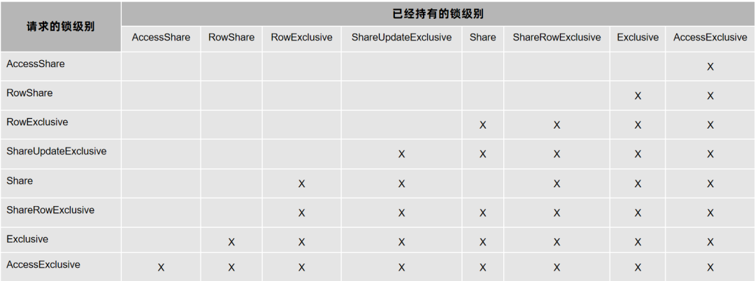ShareUpdateExclusiveLock:共享更新互斥锁,通常在VACUUM、ANALYZE操作时获取;