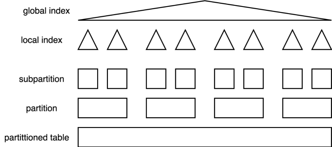 partitioned table表示主表,partition表示一级分区,subpartition表示二级分区。若用户创建的表为一级分区则数据存储在一级分区中,主表中不存储数据;若为二级分区则数据存储在二级分区中,主表和一级分区不存储数据。