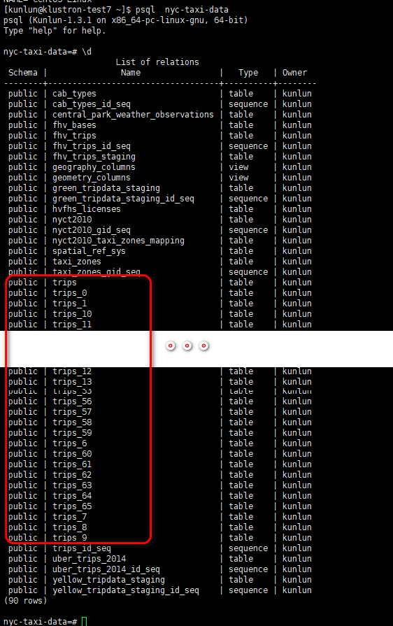 因为Klustron存储有3个分片,故对trips表设计了64个分片,分区表的名字从trips_0至trips_65,数据均匀的分布在3个分片存储的64个分区中,总记录数为1.7亿多行,如下: