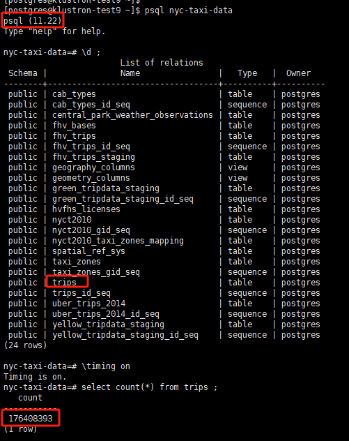 2.2 测试数据准备:(NYC Taxi Data)访问:https://github.com/toddwschneider/nyc-taxi-data/tree/master 此链接包含了纽约出租车数据的数据装载入库脚本,同时,脚本中也包含了数据下载的链接,按README的说明,对Klustron和PostgreSQL装载同等数量的数据(数据区间:2019-01至 2022-11),为测试做准备,数据准备情况如下: