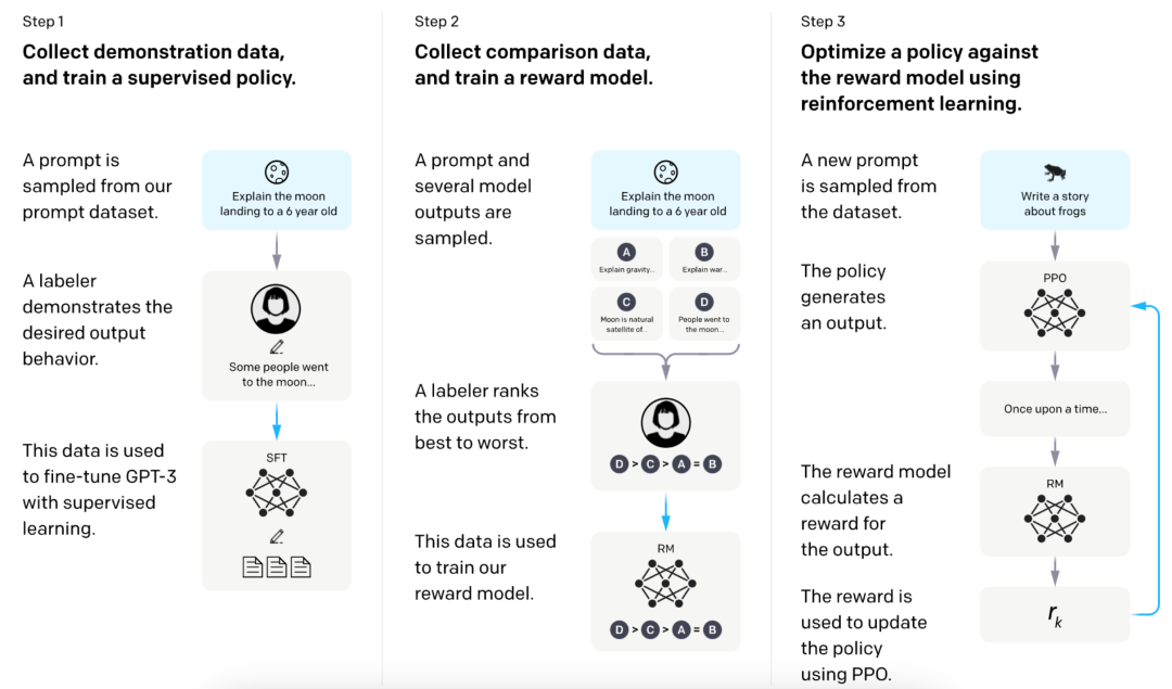 LLM完成了对大型文本语料库的“基础训练”后,就要进入“修身养性”的阶段。这包括向它提供一系列示例,说明它应该如何礼貌地和合作地回答问题(响应“提示”),以及最重要的是,它不被允许说什么(当然,这充满了反映其开发者态度和偏见的价值判断)。与初始训练步骤形成对比,初始训练步骤大多是自动化过程,这个社交化步骤是通过所谓的人类反馈强化学习(RLHF)来完成的。RLHF就是其名,人类审查LLM对一系列可能引起不当行为的提示的反应,然后一个人向它解释回应的问题(或禁止的内容),帮助LLM改进。