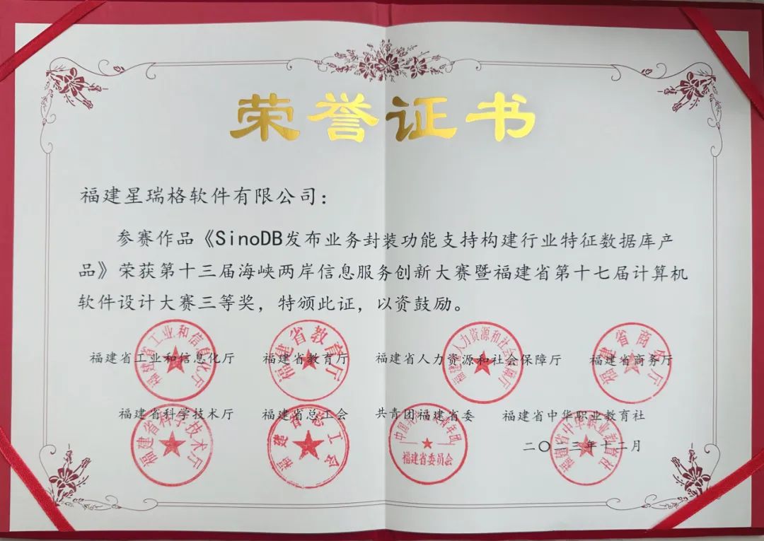 近期,由福建省工业和信息化厅、福建省教育厅、福建省人力资源和社会保障厅、福建省商务厅、福建省科学技术厅、福建省总工会、共青团福建省委、福建省中华职业教育社主办的第十三届海峡两岸信息服务创新大赛暨福建省第十七届计算机软件设计大赛落下帷幕。经过现场路演和答辩等环节的激烈比拼,福建星瑞格软件有限公司(以下简称星瑞格)的参赛作品《SinoDB发布业务封装功能支持构建行业特征数据库产品》脱颖而出,获得创业创新赛道三等奖。