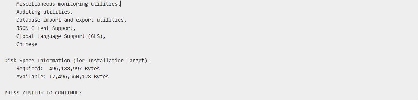 安装程序给出一个报告,列出了本次将要安装的数据库组件。按回车将继续安装。