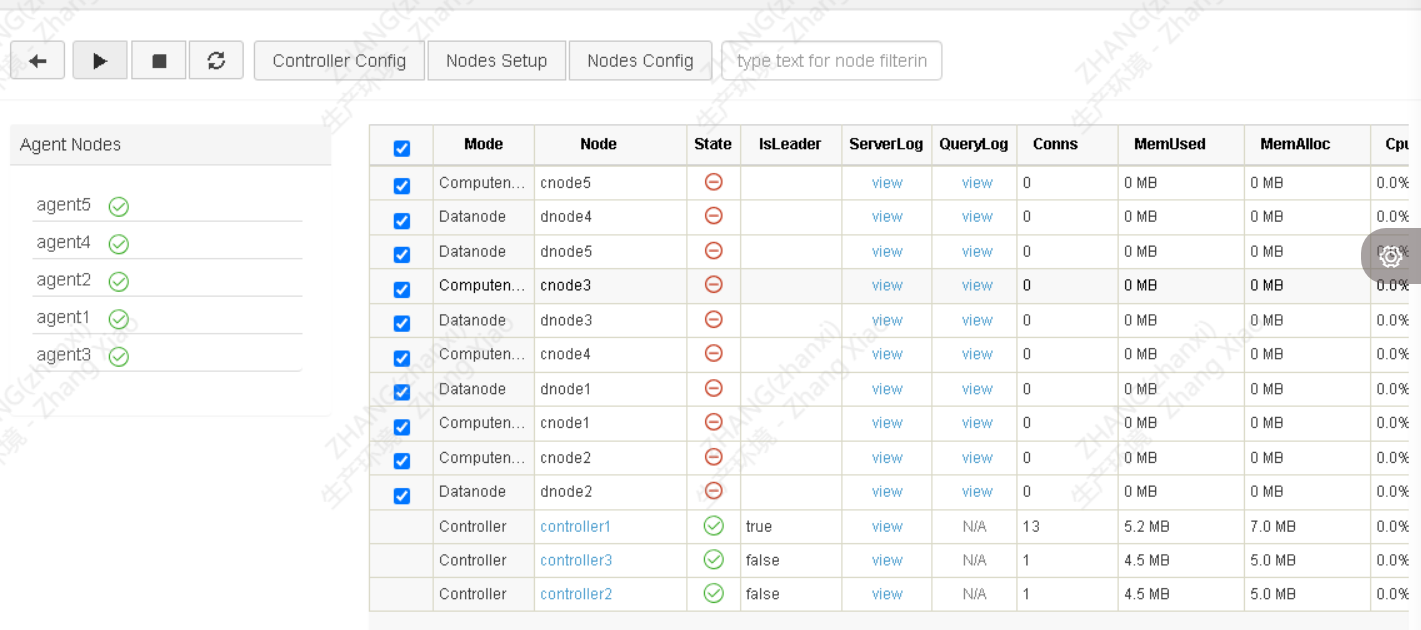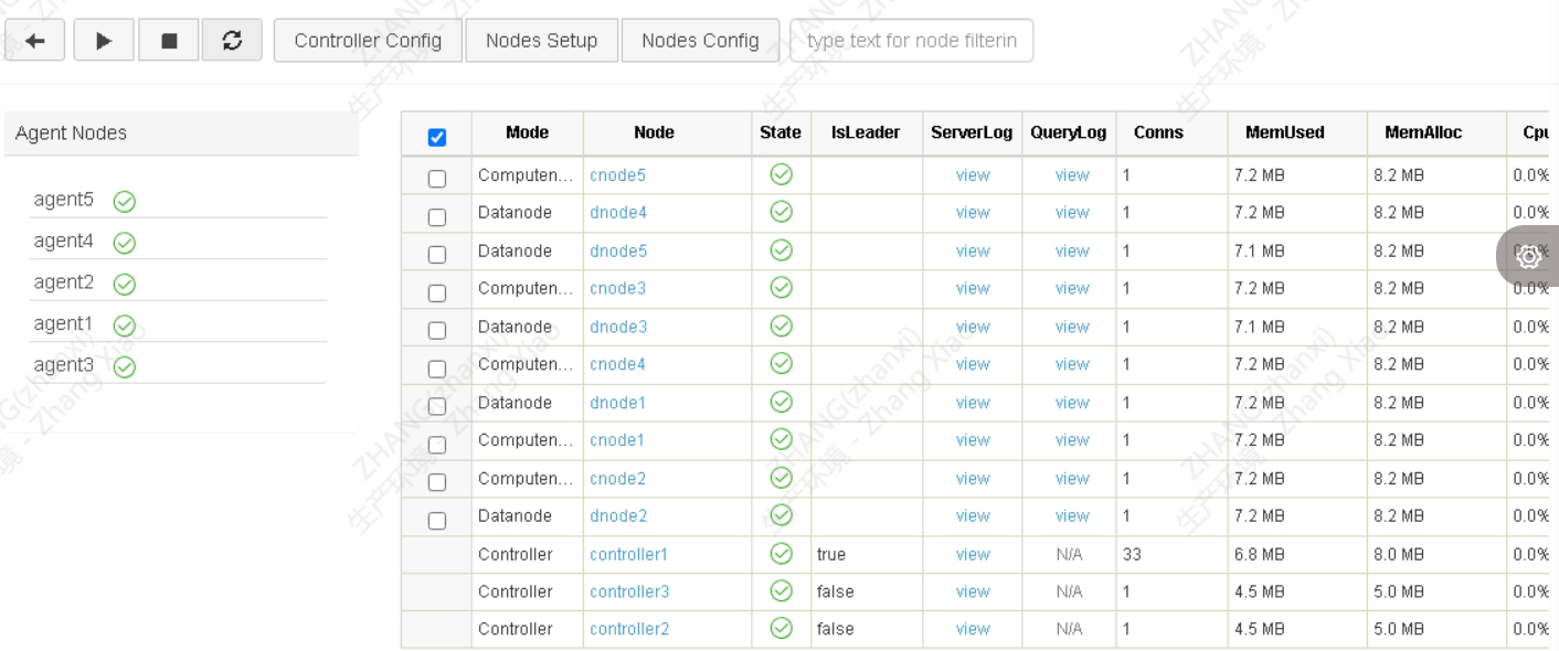 代理节点(agent):代理节点负责执行控制节点发出的启动和关闭数据节点或计算节点的命令。在一个集群中,每台物理服务器有且仅有一个代理节点。