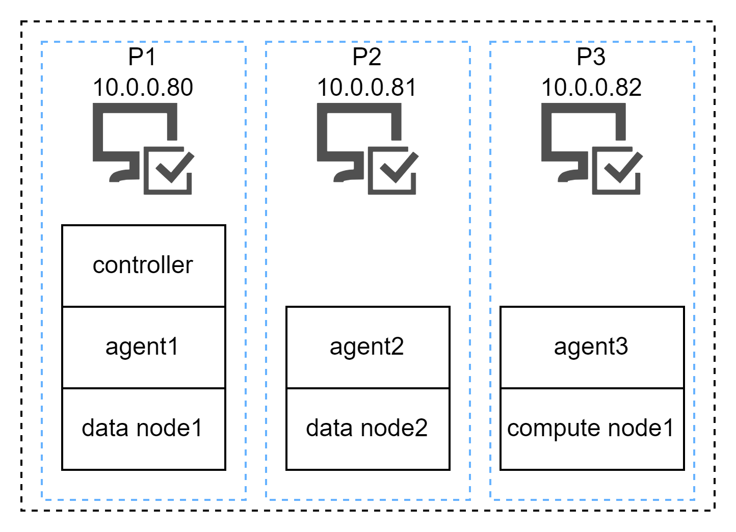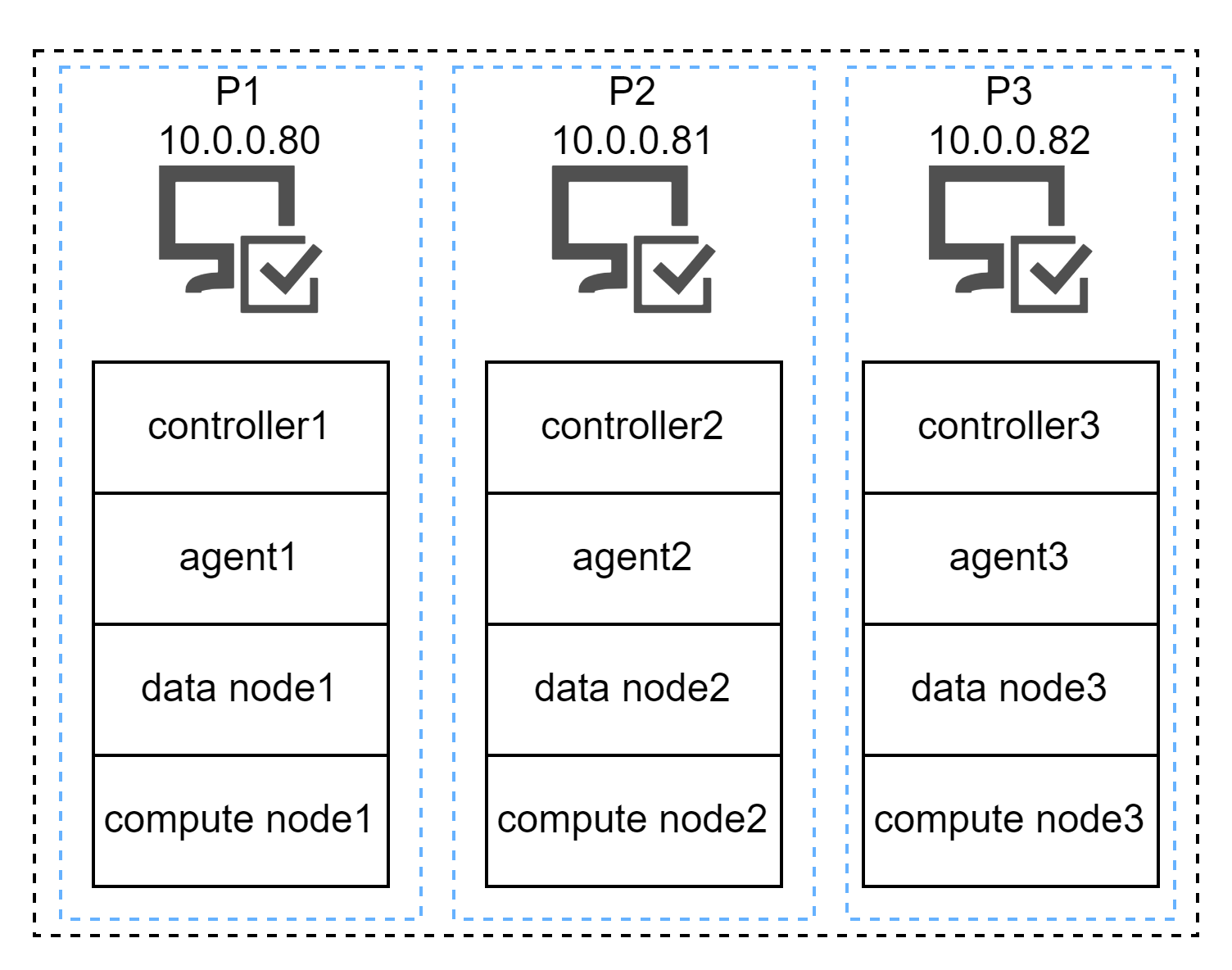 多服务器集群按照官网的架构来看,如果是3节点服务器集群,包含了1个controller,3个agent,2个data node和1个compute node。agent每个服务器必须一个,而controller也是1个,数据节点2个计算节点1个。算是一个比较简洁的方式。