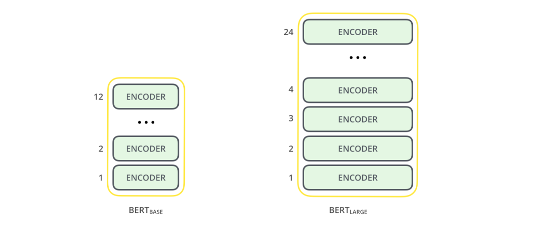 2 种不同大小规模的 BERT 模型都有大量的 Encoder 层(论文里把这些层称为 Transformer Blocks)- BASE 版本由 12 层 Encoder,Large 版本有 20 层 Encoder。同时,这些 BERT 模型也有更大的前馈神经网络(分别有 768 个和 1024 个隐藏层单元)和更多的 attention heads(分别有 12 个和 16 个),超过了原始 Transformer 论文中的默认配置参数(原论文中有 6 个 Encoder 层, 512 个隐藏层单元和 8 个 attention heads)。