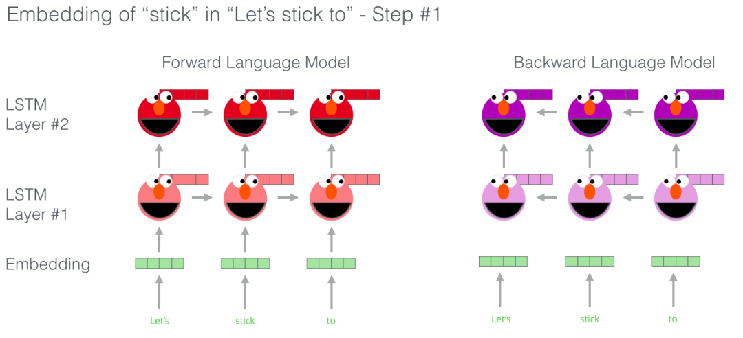 ELMo 预训练过程的其中一个步骤:以 "Let’s stick to" 作为输入,预测下一个最有可能的单词。这是一个语言建模任务。当我们在大规模数据集上训练时,模型开始学习语言的模式。例如,在 "hang" 这样的词之后,模型将会赋予 "out" 更高的概率(因为 "hang out" 是一个词组),而不是 "camera"。