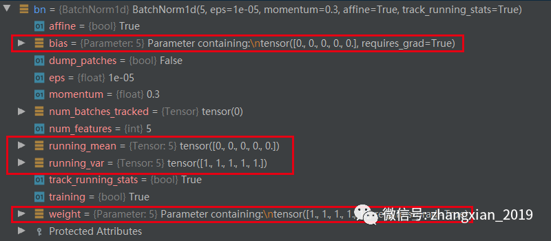 runninng_mean:均值 running_var:方差 weight:affine transform 中的 bias:affine transform 中的