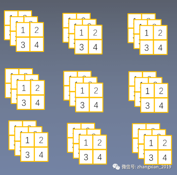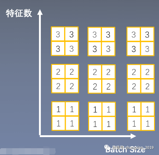 下面代码中,输入数据的形状是 ,(3, 3, 2, 2),表示一个 mini-batch 有 3 个样本,每个样本有 3 个特征,每个特征的维度是 。那么就会计算 个均值和方差,分别对应每个样本的每个特征。如下图所示: