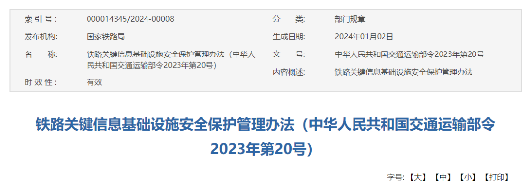 近日,国家铁路局正式发布《铁路关键信息基础设施安全保护管理办法(中华人民共和国交通运输部令2023年第20号)》,自2024年2月1日起施行。