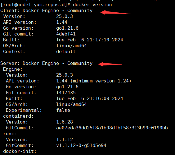 1)查看docker版本(有client和service两部分表示docker安装启动都成功了)[root@node1 yum.repos.d]# docker version