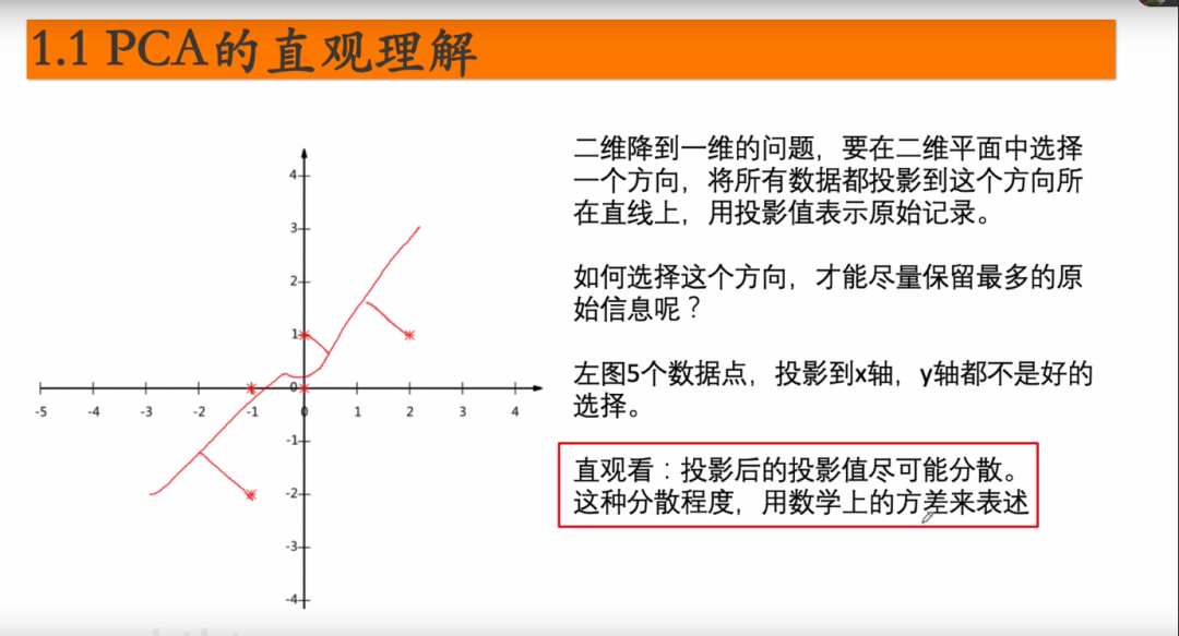 一种直观的看法是:希望投影后的投影值尽可能分散,因为如果重叠就会有样本消失。当然这个也可以从熵的角度进行理解,熵越大所含信息越多。