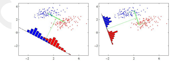 从上图直观看出,右图红色数据和蓝色数据在各自的区域来说相对集中,根据数据分布直方图也可看出,所以右图的投影效果好于左图,左图中间直方图部分有明显交集。