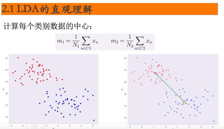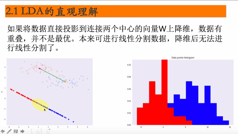 1) 多维空间中,数据处理分类问题较为复杂,LDA 算法将多维空间中的数据投影到一条直线上,将 d 维数据转化成 1 维数据进行处理。