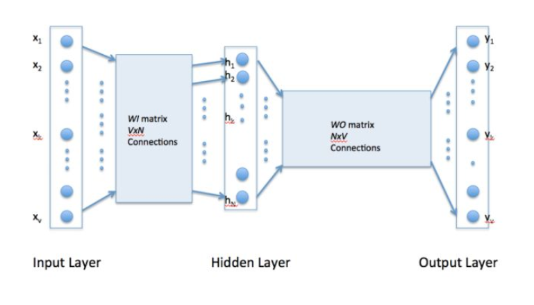 举个例子,有个句子“I drive my car to the store”。我们如果把”car”作为训练输入数据,窗口大小设置为6,那么{“I”, “drive”, “my”, “to”, “the”, “store”}就是输出。所有这些单词会进行one-hot编码。skip-gram模型图如下所示: