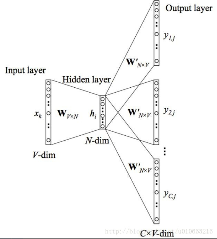 在输出层,不再是一个多项式分布,而是输出C个多项式分布。每一个输出用同一个W’计算,同样采用Softmax计算概率,误差为所有输出{y1,…,yC}的误差和,采用交叉熵做损失函数,最后用BP算法更新参数。