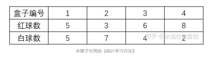 假设有4个盒子,每个盒子里面有不同数量的红、白两种颜色的球,如下表