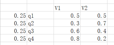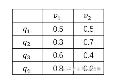 这个表格 可以用一个4*2的矩阵表示(称为观测概率矩阵,也有资料叫做发射矩阵)