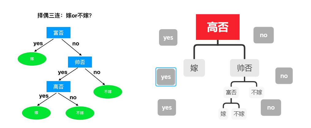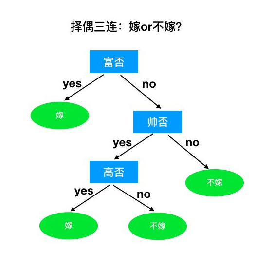 如果你是女性,你面临这一个择偶的问题,前面有一些男性,于是你在心里做了一些“决策”来决定选择谁,把你的决策结果画下来就是一颗树了,如下图