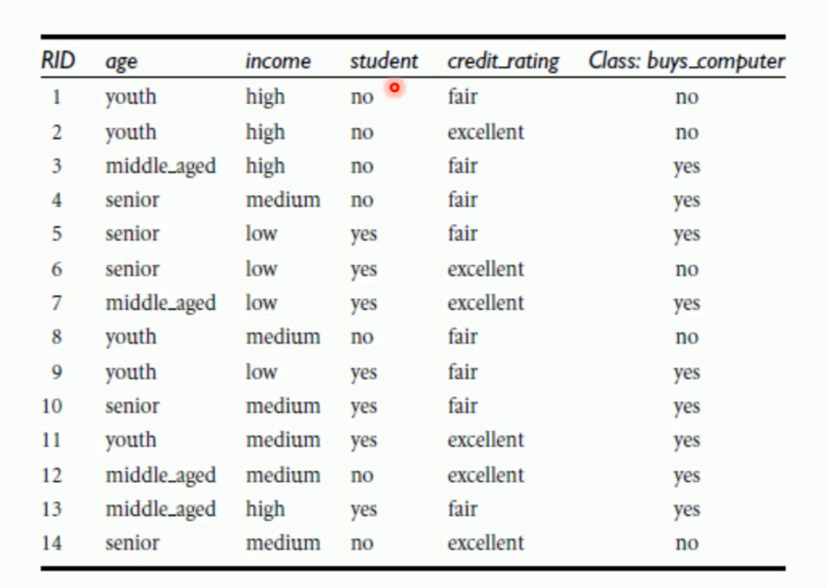 上 个太简单了 特征太少 无效特征也少。只是举例说明什么是决策树 下图是一个人的信息和是否购买 电脑的 统计表 和生成的决策树