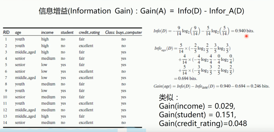 很难懂吧 。简单以上面的男生例子来说 就是 {富} 对 {高, 富,帅}男生特征集群的的增益最高 ,而是否购买电脑这个数据集来说 年龄是信息增益最大的 的。结论是通过 大量样本数据计算得来的。