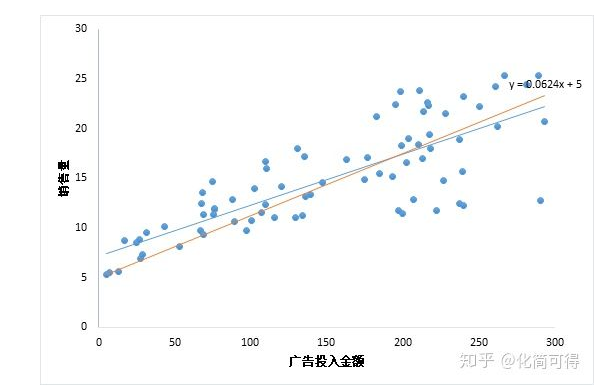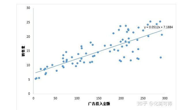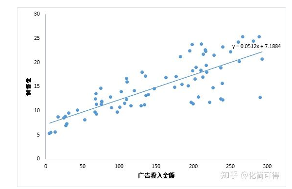 这里我们得到的拟合方程是y = 0.0512x + 7.1884,此时当我们获得一个新的广告投入金额后,我们就可以用这个方程预测出大概的销售量。