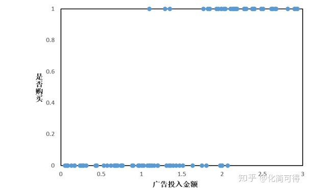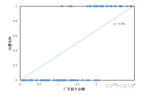 一些问题中,因变量y是分类型,只取0、1两个值,和x的关系不是上面那样。假设我们有这样一组数据:给不同的用户投放不同金额的广告,记录他们购买广告商品的行为,1代表购买,0代表未购买