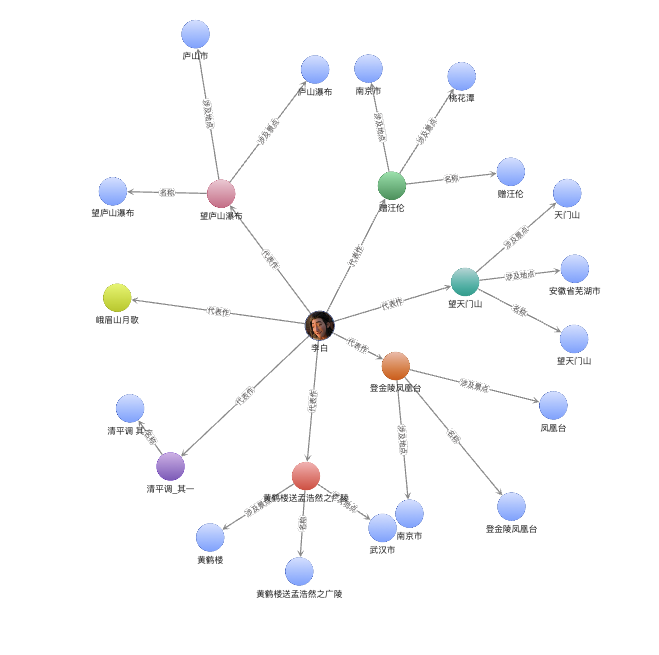 我们可以将生成的RDF数据无缝导入gStore中进行存储与管理。gStore是由北京大学王选计算机研究所邹磊教授领导的数据管理研究室(PKUMOD)研发的面向知识图谱的开源图数据库系统,支持数据库的增删改查、导入、导出、备份、还原、事务ACID等功能;支持横向动态扩展解决存储容量限制;在查询速度方面通过底层的源头创新可在百亿规模的数据集且包含六跳查询情况下做到秒级响应。 2023年11月,gStore 上线发布了最新的V1.2版本,在V1.0版本基础上新增及优化了多项功能,详情请查看文章《gStore 1.2版本正式上线,体验再度升级!》,开源地址为:https://github.com/pkumod/gStore欢迎大家下载试用。知识图谱构建完成后,我们就可以开始对李白及他的“朋友圈”用图的方式开始探索啦~我们可以在gStore可视化管理工具gWorkbench中输入SPARQL查询语句对整体的人物关系进行查询。查询语句:SELECT *