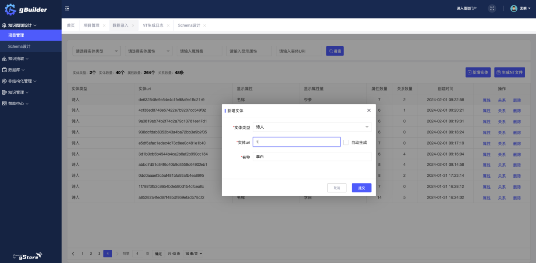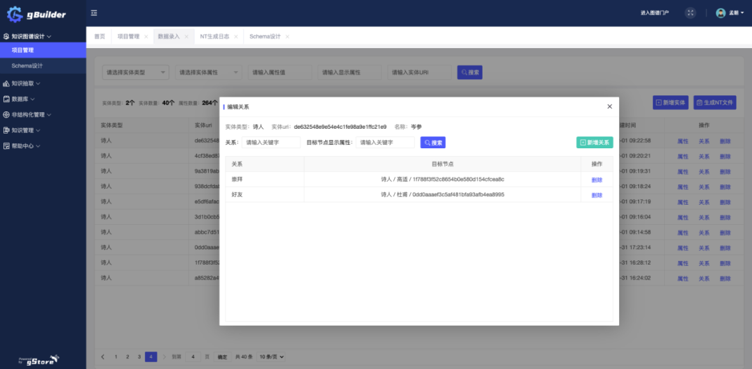 本次我们从互联网上搜集了有关《长安三万里》中的人物以及其他唐代著名诗人的基本信息,然后以诗人、诗歌为主要实体类型,梳理了诗人之间的关系,在gBuilder中用非结构化数据表单录入的方式,最终得到了唐朝诗人关系的RDF文件。(文件下载地址http://file.gstore.cn/f/3ff6db5ed4604abbbb5a/?dl=1)RDF文件是构建知识图谱的基础,有了RDF文件之后,大家就可以构建知识图谱了。在实际项目中,也可以根据不同类型的数据选择不同的抽取方式,或多种方式结合的形式来构建知识图谱。