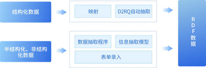 此外,我们还提供了表单录入的方式,用户可通过填写表单便捷快速地构建知识图谱。首先,平台会根据schema自动生成每种实体类型的表单;然后,用户直接在页面上即可新增实体,通过填写表单的方式,录入实体属性及关系,最后生成RDF数据。