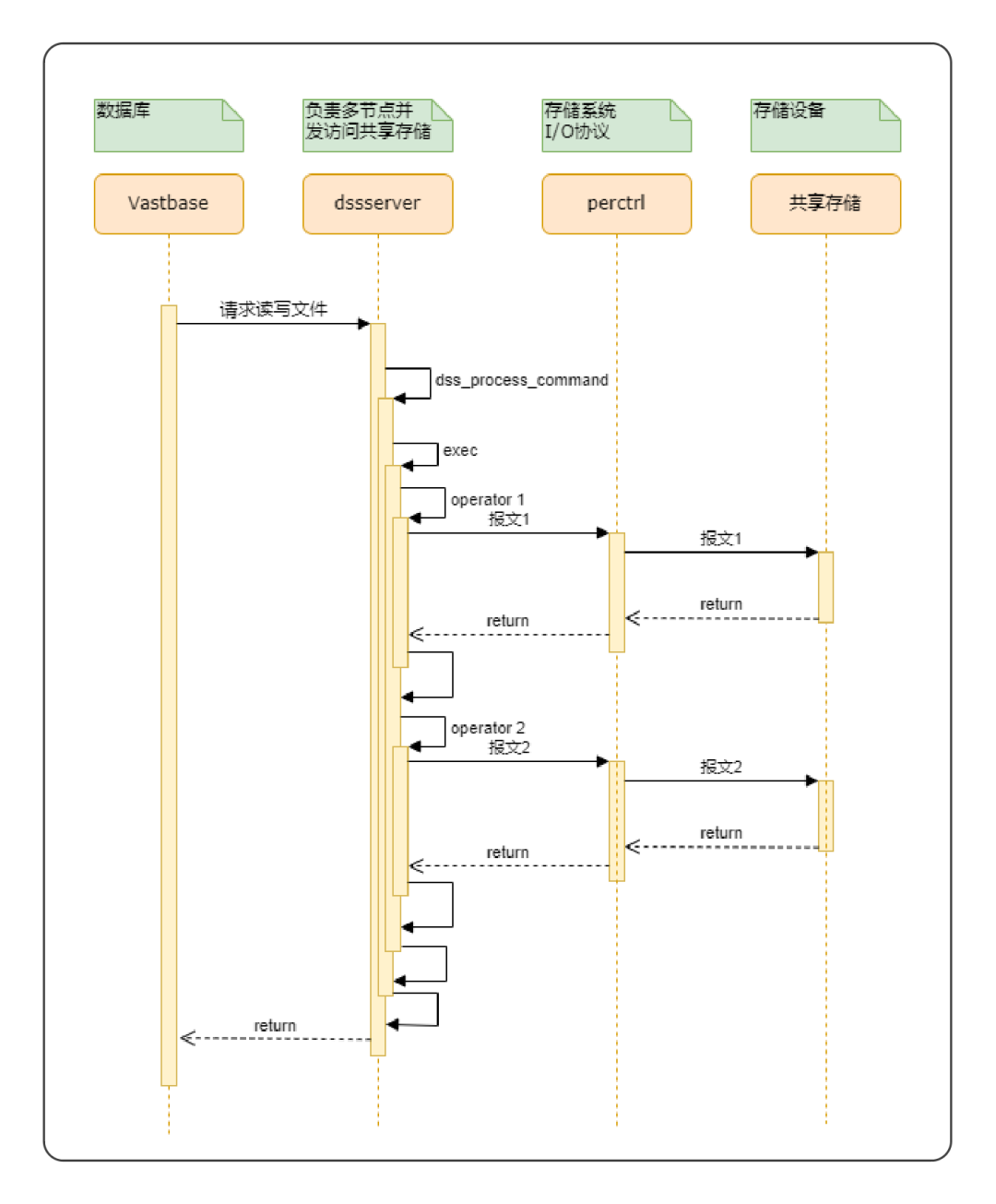 Vastbase 在处理请求时,需要对数据文件、在线日志等文件进行读写操作。在共享存储架构中, Vastbase 把文件的操作请求发送给 dssserver,dssserver 处理把相应的请求通过网络发送给共享存储设备,把结果反馈给 Vastbase 数据库。