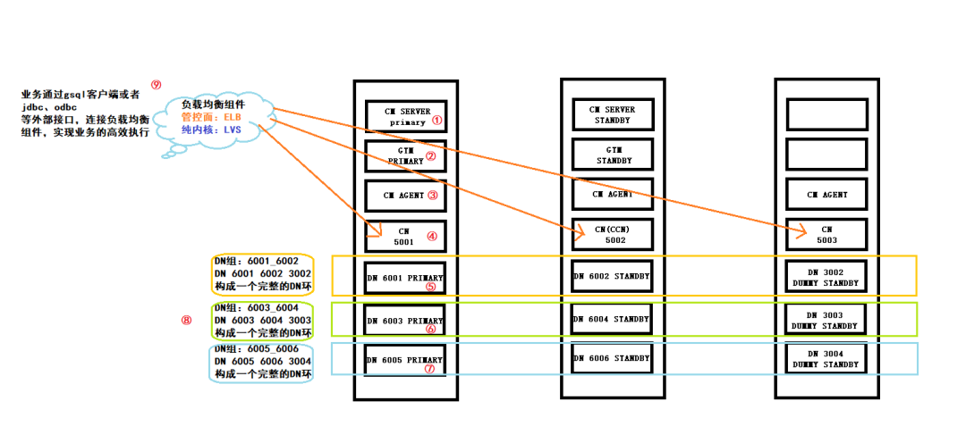 ⑧:DN组和DN环,一个主DN和其备DN以及从备DN,称为一个DN组,使用主DN和备DN的实例编号下划线连接表示,如dn_6001_6002。一个节点上所有主DN及其备DN和从备DN的组合,称为一个DN环。对于大规模集群,若单个节点的DN数超过1个,DN环可能超过个3节点。如,6节点集群,节点1有两个主DN,DN组1主备从分布在节点123,DN组2主备从分布在134,则称之为4节点成环。