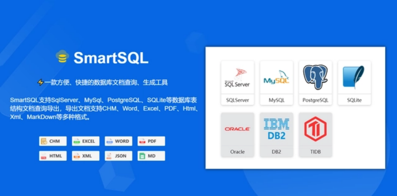 SmartSQL 是一款开源的数据库文档管理工具!支持SqlServer、MySql、PostgreSql、SQLite等多种数据库文档查询、生成。该工具从最初支持CHM文档格式开始,通过开源,集思广益,不断改进,又陆续支持Word、Excel、PDF、Html、XML、Json、MarkDown等文档格式的导出。同时支持对数据库表、视图、存储过程进行自定义分组管理、导出。
