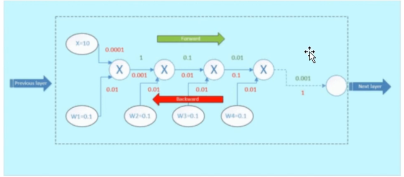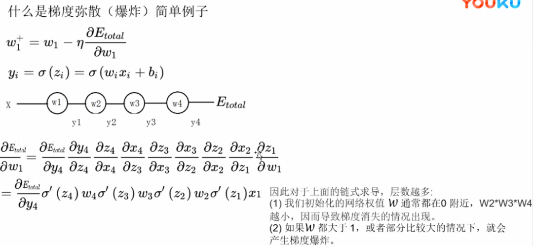 对激活函数进行求导,如果此部分大于1,那么层数增多的时候,最终的求出的梯度更新将以指数形式增加,即发生梯度爆炸,如果此部分小于1,那么随着层数增多,求出的梯度更新信息将会以指数形式衰减,即发生了梯度消失。