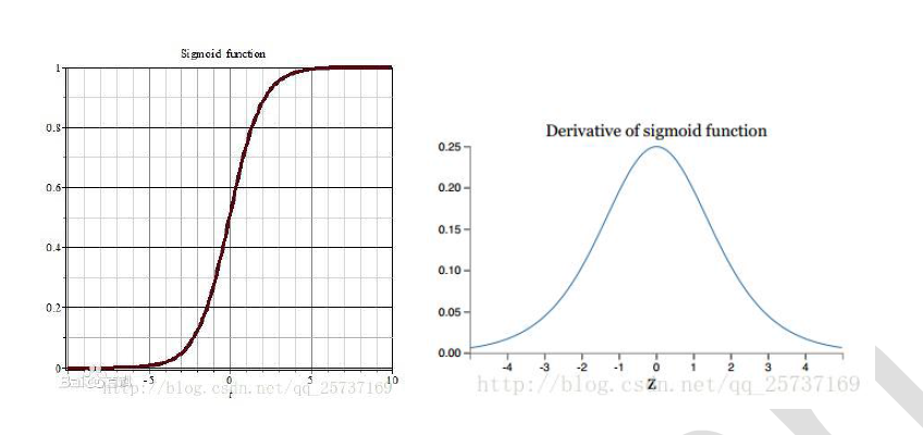 计算权值更新信息的时候需要计算前层偏导信息,因此如果激活函数选择不合适,比如使用sigmoid,梯度消失就会很明显了,原因看下图,左图是sigmoid 的损失函数图,右边是其倒数的图像,如果使用sigmoid 作为损失函数,其梯度是不可能超过0.25 的,这样经过链式求导之后,很容易发生梯度消失。