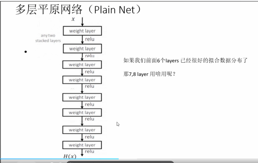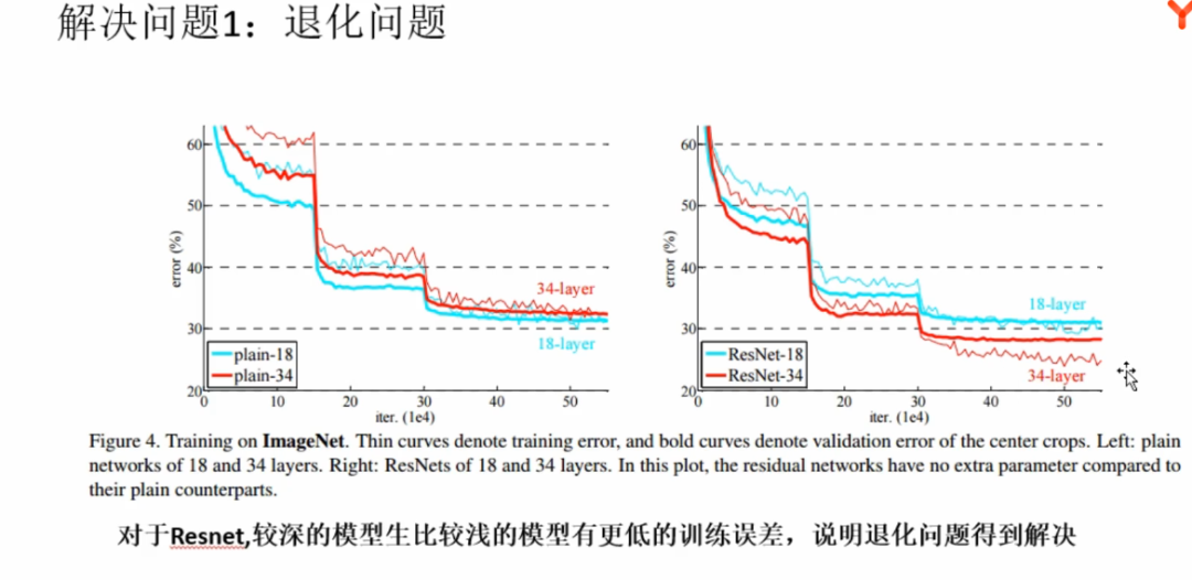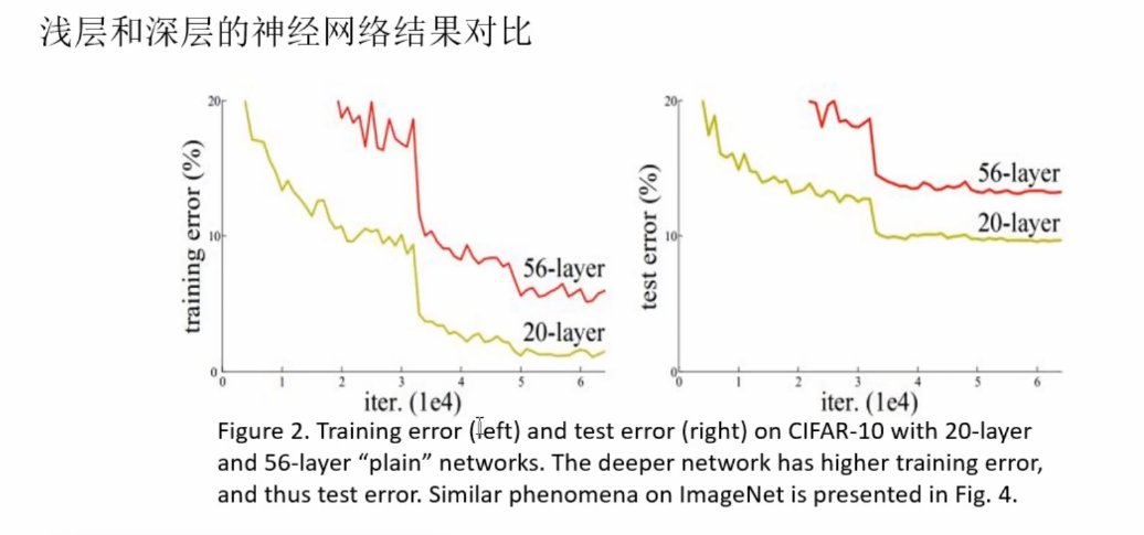 随着网络层数的增加,网络发生了退化(degradation)的现象:随着网络层数的增多,训练集loss逐渐下降,然后趋于饱和,当你再增加网络深度的话,训练集loss反而会增大。注意这并不是过拟合,因为在过拟合中训练loss是一直减小的。当网络退化时,浅层网络能够达到比深层网络更好的训练效果
