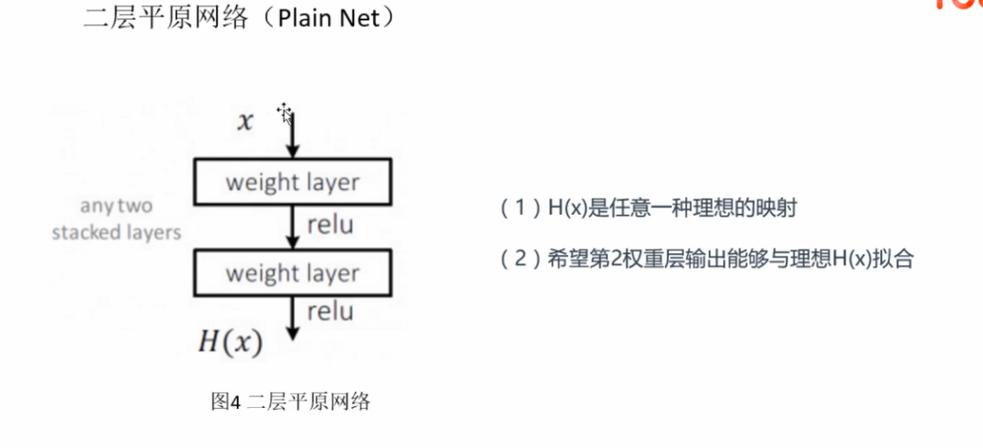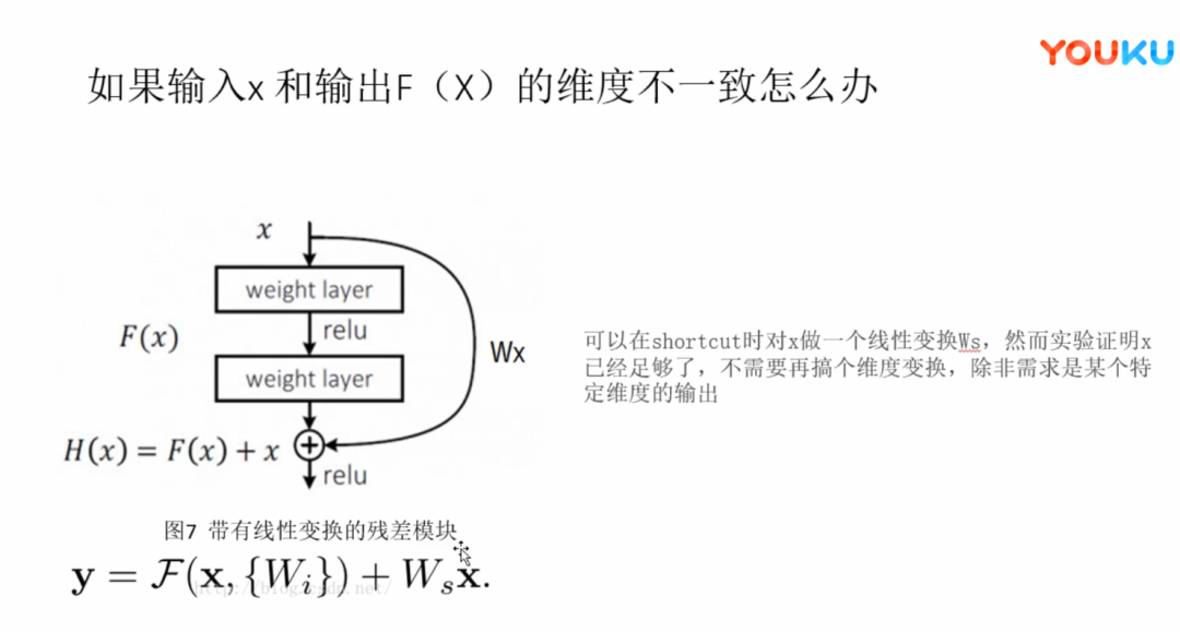 举个例子,假设已经有了一个最优化的网络结构,图左边。当我们设计网络结构的时候,我们并不知道具体多少层次的网络时最优化的网络结构,假设为18层,设计了34层网络结构。那么多出来的16层其实是冗余的,我们希望训练网络的过程中,模型能够自己训练这五部分为恒等映射,也就是经过这层时的输入与输出完全一样。但是往往模型很难将这16层恒等映射的参数学习正确,那么就一定会不比最优化的18层网络结构性能好,这就是随着网络深度增加,模型会产生退化现象。它不是由过拟合产生的,而是由冗余的网络层学习了不是恒等映射的参数造成的。