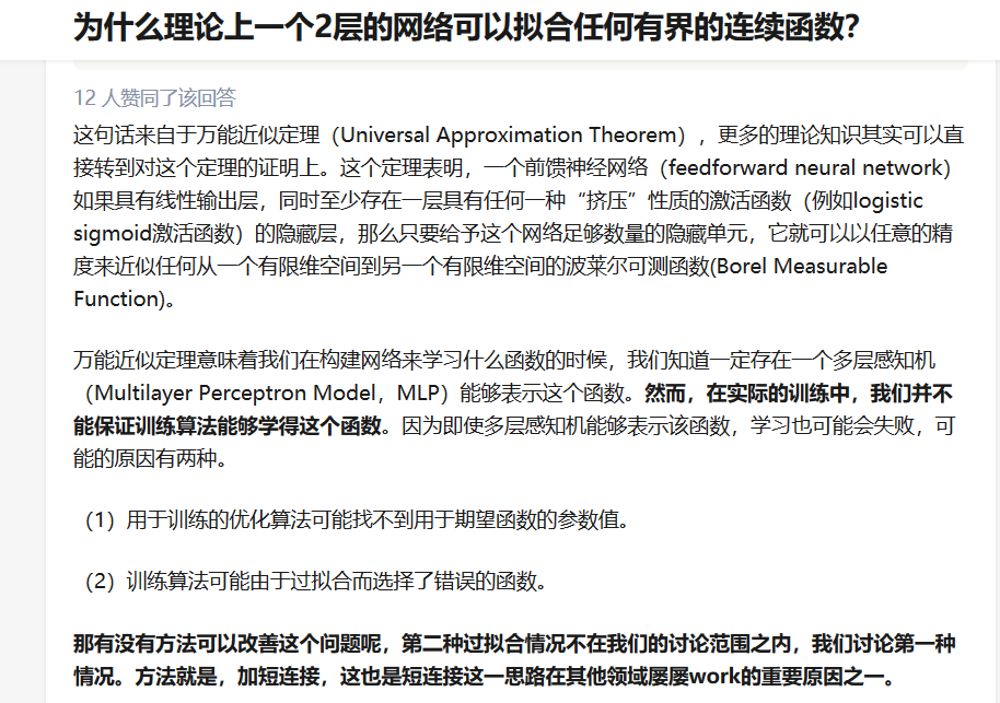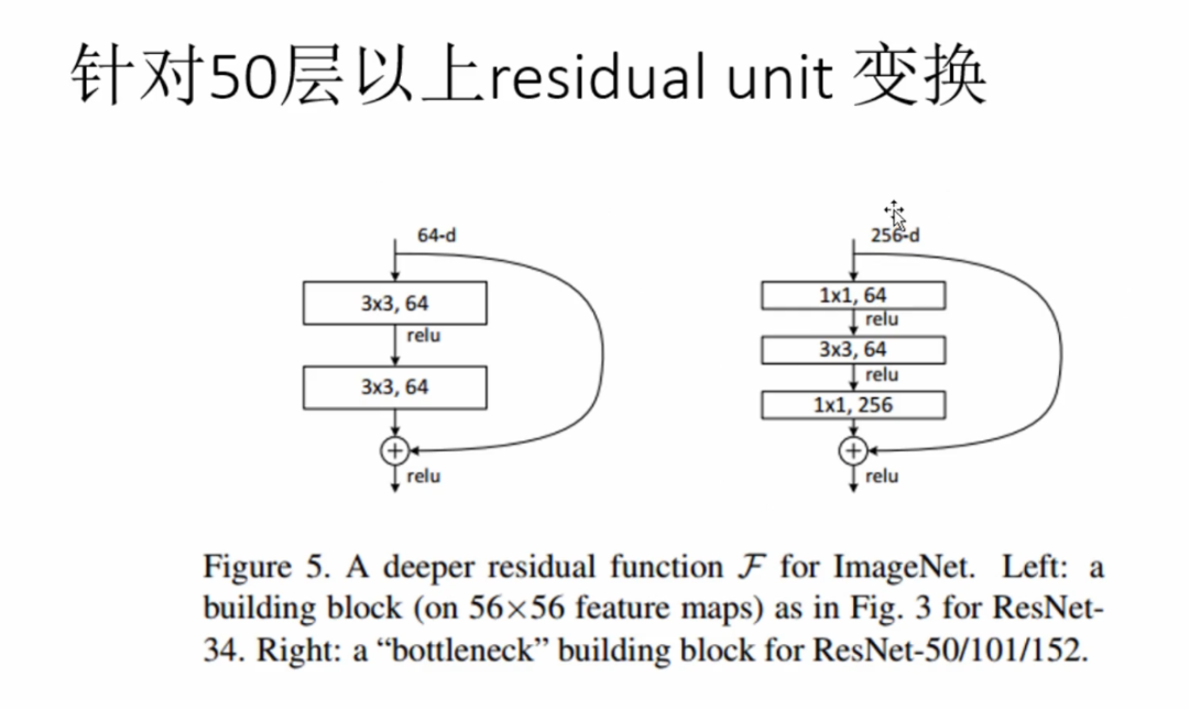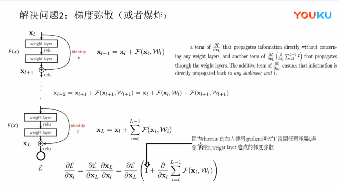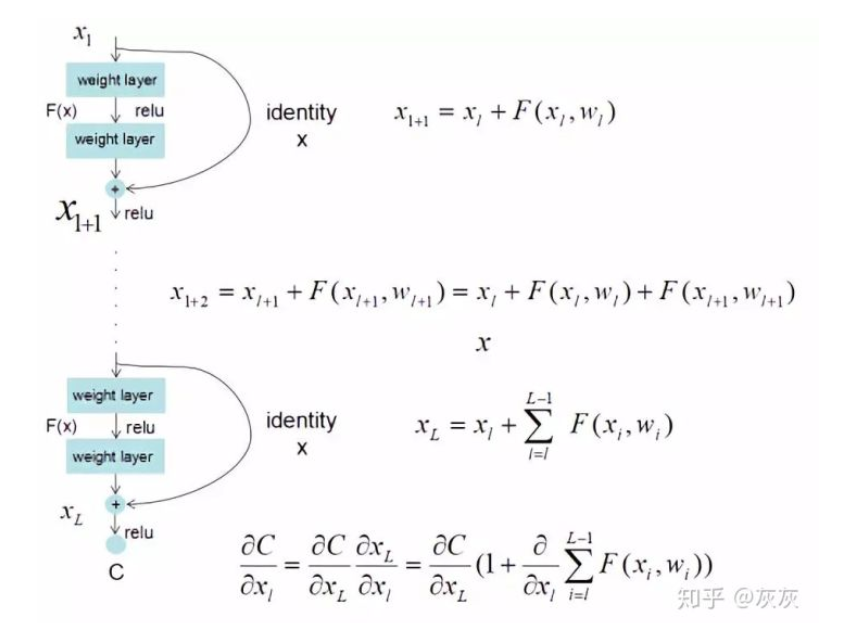 由于h(x)=F(x)+x,由于链式求导后的结果如图所示,不管括号内右边部分的求导参数有多小,因为左边的1的存在,并且将原来的链式求导中的连乘变成了连加状态(正是 ),都能保证该节点参数更新不会发生梯度消失或梯度爆炸现象。