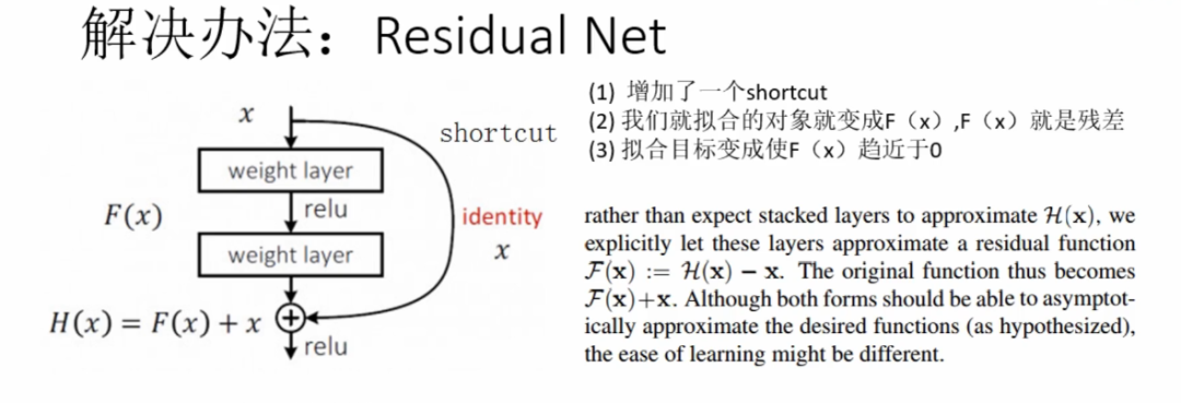 在引入ResNet之前,我们想让该层学习到的参数能够满足h(x)=x,即输入是x,经过该冗余层后,输出仍然为x。但是可以看见,要想学习h(x)=x恒等映射时的这层参数时比较困难的。ResNet想到避免去学习该层恒等映射的参数,使用了如上图的结构,让h(x)=F(x)+x;这里的F(x)我们称作残差项,我们发现,要想让该冗余层能够恒等映射,我们只需要学习F(x)=0。学习F(x)=0比学习h(x)=x要简单,因为一般每层网络中的参数初始化偏向于0,这样在相比于更新该网络层的参数来学习h(x)=x,该冗余层学习F(x)=0的更新参数能够更快收敛。