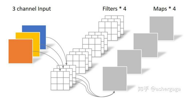 对于一张5×5像素、三通道(shape为5×5×3)图像,经过3×3卷积核的卷积层(假设输出通道数为4,则卷积核shape为3×3×3×4,最终输出4个Feature Map,如果有same padding则尺寸与输入层相同(5×5),