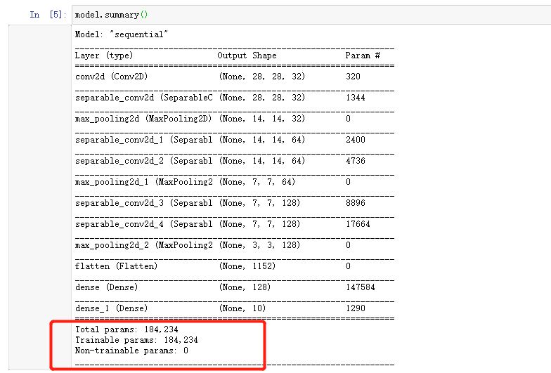 model = keras.models.Sequential()#一般在输入层使用普通卷积 输入层之后 使用深度可分离卷积。model.add(keras.layers.Conv2D(filters=32, kernel_size=3,padding='same',activation='selu',input_shape=(28, 28, 1)))model.add(keras.layers.SeparableConv2D(filters=32, kernel_size=3,padding='same',activation='selu'))model.add(keras.layers.MaxPool2D(pool_size=2))model.add(keras.layers.SeparableConv2D(filters=64, kernel_size=3,padding='same',activation='selu'))model.add(keras.layers.SeparableConv2D(filters=64, kernel_size=3,padding='same',activation='selu'))model.add(keras.layers.MaxPool2D(pool_size=2))model.add(keras.layers.SeparableConv2D(filters=128, kernel_size=3,padding='same',activation='selu'))model.add(keras.layers.SeparableConv2D(filters=128, kernel_size=3,padding='same',activation='selu'))model.add(keras.layers.MaxPool2D(pool_size=2))model.add(keras.layers.Flatten())model.add(keras.layers.Dense(128, activation='selu'))model.add(keras.layers.Dense(10, activation="softmax"))model.compile(loss="sparse_categorical_crossentropy",optimizer = "sgd",metrics = ["accuracy"])