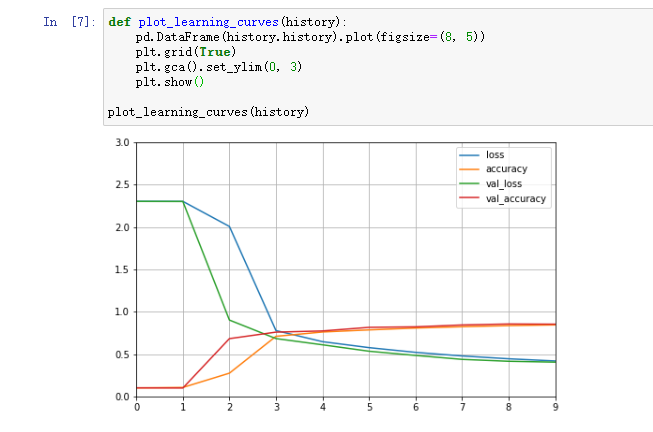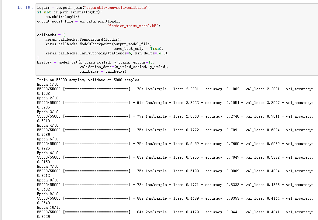 # 回调函数 Tensorboard(文件夹)\earylystopping\ModelCheckpoint(文件名)logdir = os.path.join("separable_cnn-selu-callbacks")print(logdir)if not os.path.exists(logdir):os.mkdir(logdir)# 文件名output_model_file = os.path.join(logdir,"fashion_mnist_model.h5")callbacks = [keras.callbacks.TensorBoard(logdir),keras.callbacks.ModelCheckpoint(output_model_file,save_best_only=True),keras.callbacks.EarlyStopping(patience=5,min_delta=1e-3),]# 开始训练history = model.fit(x_train_scaled,y_train,epochs=10,validation_data=(x_valid_scaled,y_valid),callbacks=callbacks)