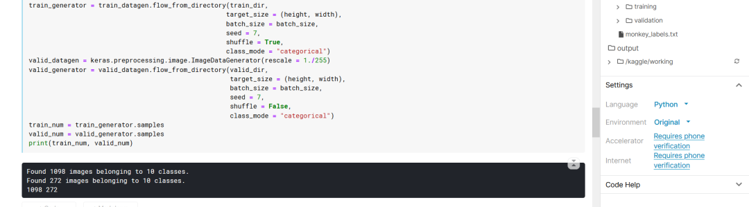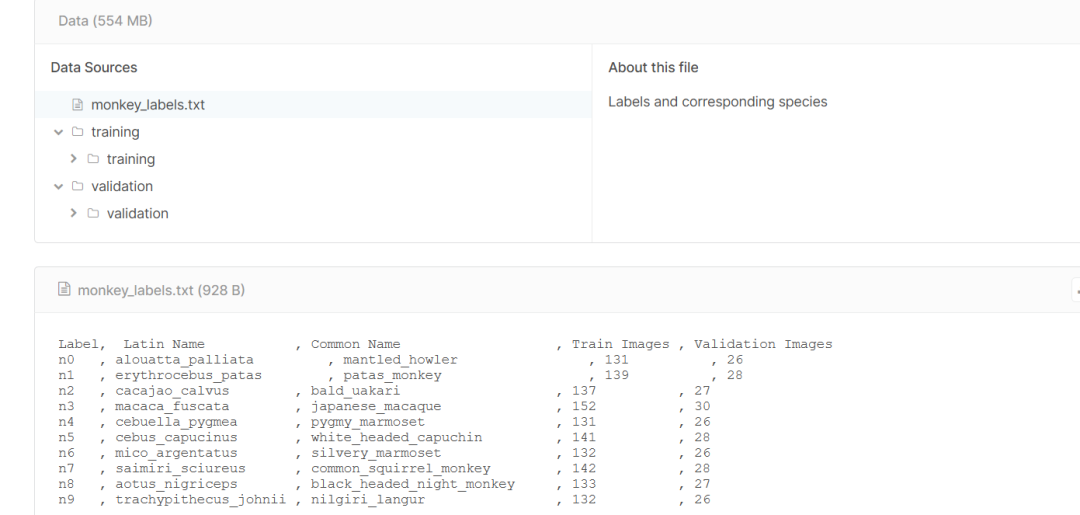 # 文件路径train_dir = '../input/10-monkey-species/training/training'valid_dir = "../input/10-monkey-species/validation/validation"label_file = '../input/10-monkey-species/monkey_labels.txt'print(os.path.exists(train_dir))print(os.path.exists(valid_dir))print(os.path.exists(label_file))print(os.listdir(train_dir))print(os.listdir(valid_dir))