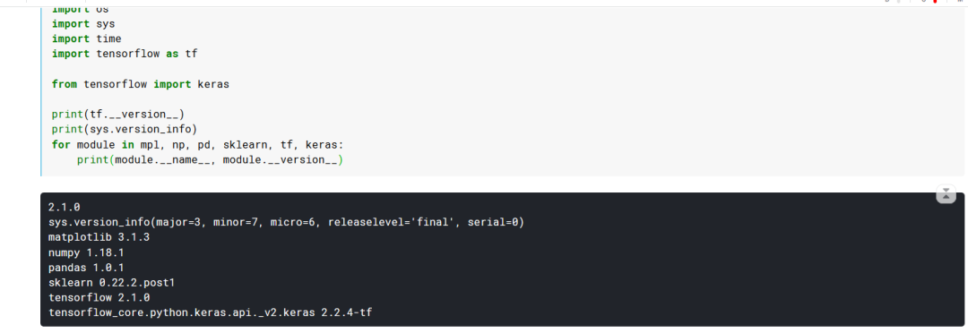 %matplotlib inlineimport matplotlib as mplimport matplotlib.pyplot as lptimport numpy as npimport pandas as pdimport sklearnimport os,sysimport tensorflow as tfimport timefrom tensorflow import kerasprint(tf.__version__)print(sys.version_info)for module in mpl,pd,sklearn,tf,keras:print(module.__name__,module.__version__)