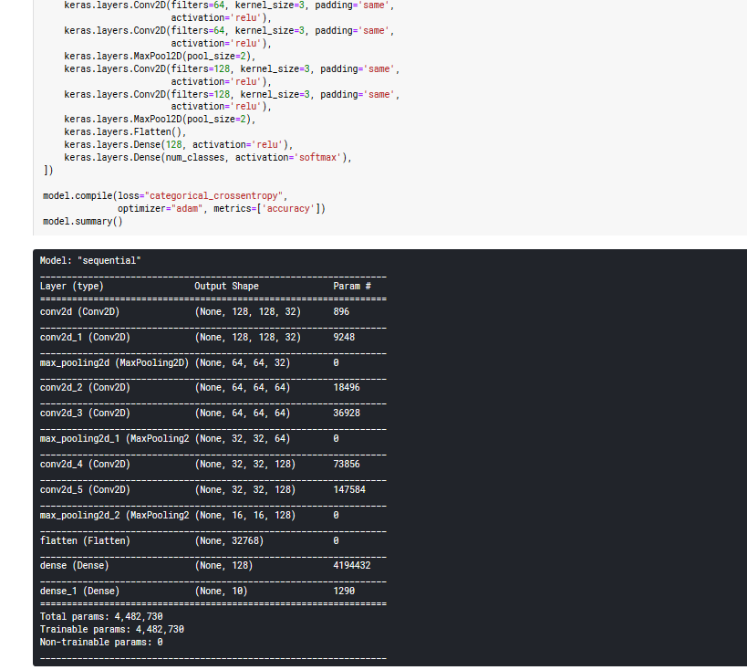 model = keras.models.Sequential([keras.layers.Conv2D(filters=32,kernel_size=3,padding='same',activation='relu',input_shape=[width,height,channels]),keras.layers.Conv2D(filters=32,kernel_size=3,padding='same',activation='relu'),keras.layers.MaxPool2D(pool_size=2),keras.layers.Conv2D(filters=64,kernel_size=3,padding='same',activation='relu'),keras.layers.Conv2D(filters=64,kernel_size=3,padding='same',activation='relu'),keras.layers.MaxPool2D(pool_size=2),keras.layers.Conv2D(filters=128,kernel_size=3,padding='same',activation='relu'),keras.layers.Conv2D(filters=128,kernel_size=3,padding='same',activation='relu'),keras.layers.MaxPool2D(pool_size=2),# 展平keras.layers.Flatten(),keras.layers.Dense(128,activation='relu'),keras.layers.Dense(num_classes,activation='softmax'),])model.compile(loss='categorical_crossentropy',optimizer='adam',metrics=['accuracy'])model.summary()