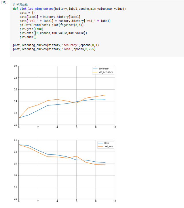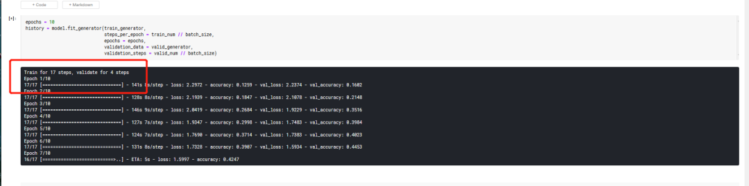 epochs = 10history = model.fit_generator(train_generator,steps_per_epoch = train_num // batch_size,epochs=epochs,validation_data = valid_generator,validation_steps=valid_num // batch_size)