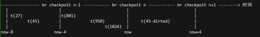 在br checkpoit n 时,假设有t(27)、t(45)、t(801)、t(950)、t(1024) 五个未提交事务,超过4小时的t(27)、t(45)会被br checkpoit n缓存到磁盘