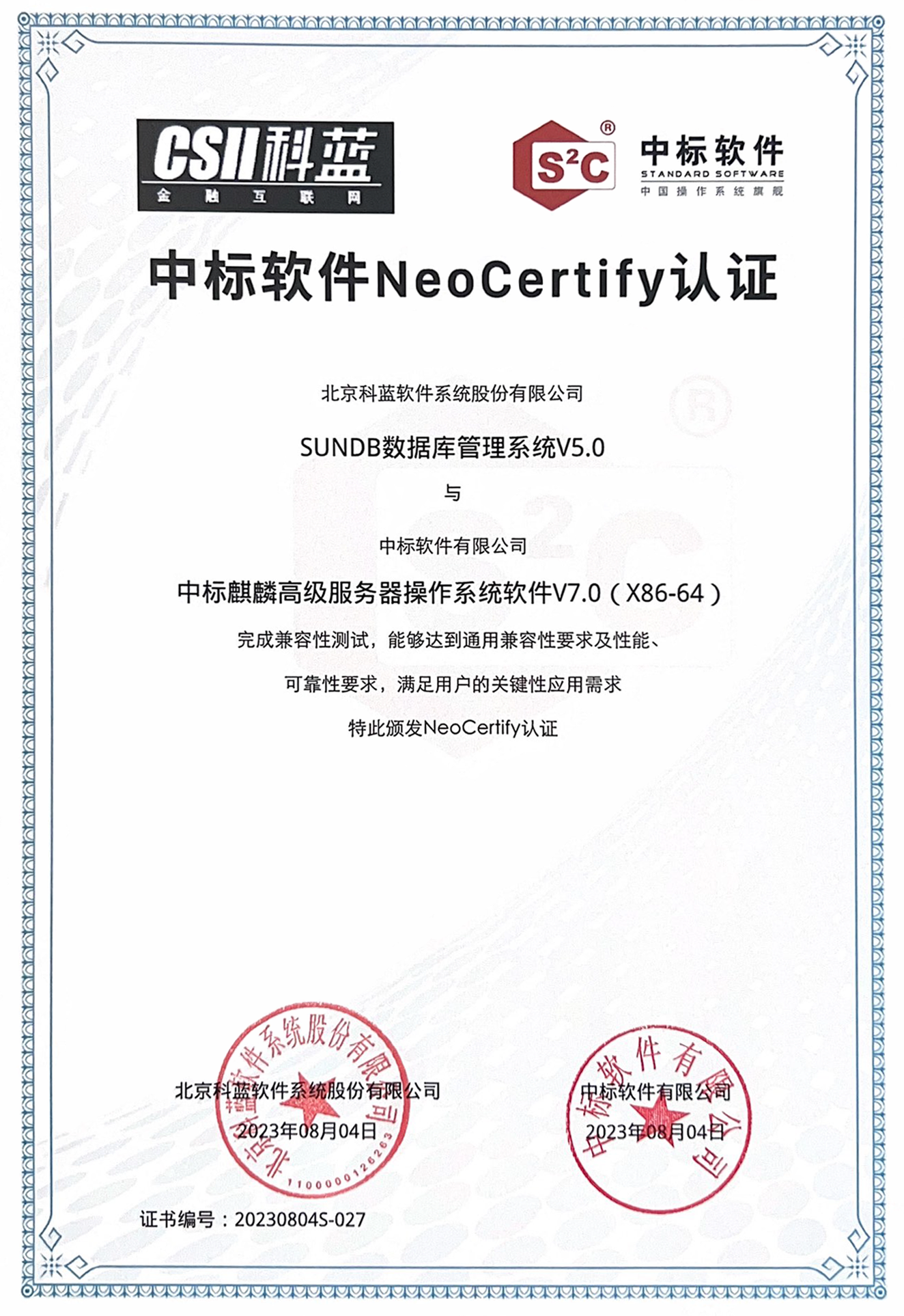 北京科蓝软件系统股份有限公司与中标软件有限公司完成产品互兼容适配认证。通过共同测试,科蓝软件SUNDB数据库管理系统V5.0、SUNDB分布式数据库管理系统V5.0、SUNDB内存数据库管理系统V5.0与中标麒麟高级服务器操作系统软件V7.0(X86-64)能够达到通用兼容性要求及性能、可靠性要求,满足用户的关键性应用需求。